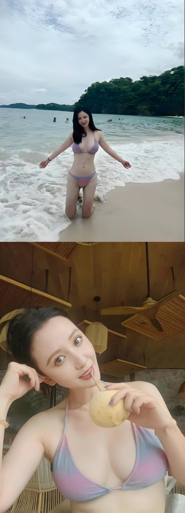 张萌前两天在海边发了组照片,直接炸了。 就那套粉紫渐变的比基尼,挂脖的,低腰的,她往那儿一站,黑长直配大红唇,墨镜一戴,我的天,评论区直接疯了。 满屏都是“姐姐杀我”,还有人说“这身材是45岁? 我不信”。