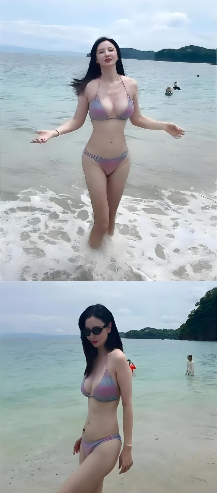 这套比基尼的选品堪称教科书级。粉紫渐变的闪面材质,在阳光下泛着细碎光泽,既没有过度张扬的俗气,又能在茫茫海滩里精准抓住视线。挂脖三角杯的设计,刚好勾勒出流畅胸线,还悄悄拉长了颈部线条,把小性感拿捏得游刃有余;低腰三角裤的剪裁,恰好卡在腰线最纤细的位置,衬得腰臀比例惊艳十足,大长腿的优势也尽数展现。