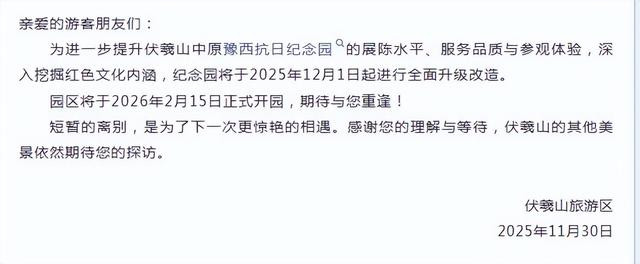 为进一步提升伏羲山中原豫西抗日纪念园的展陈水平、服务品质与参观体验,深入挖掘红色文化内涵,纪念园将于2025年12月1日起进行全面升级改造。园区将于2026年2月15日正式开园,期待与您重逢!