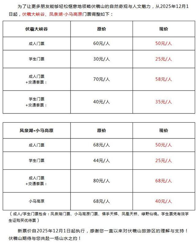 记者还了解到,为了让更多朋友能够轻松惬意地领略伏羲山的自然奇观与人文魅力,从2025年12月1日起,伏羲大峡谷、凤泉湖·小马高原门票调整如下: