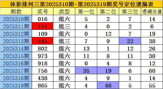 开奖回顾:排列三第2025319期奖号为:865,各位号码遗漏值分别为4、46、5,遗漏总值为55。
