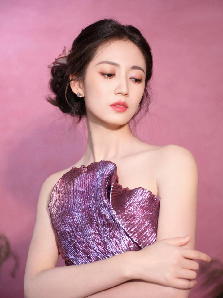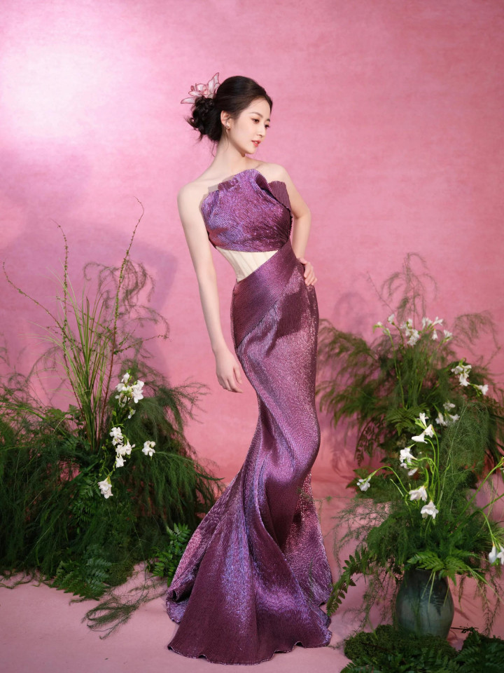 陈钰琪一袭暗紫色裹胸露背开衩长裙搭配盘发,肌肤白皙水嫩,身姿婀娜飘逸,优美肩颈线清晰流畅,粉嫩美背性感迷人。