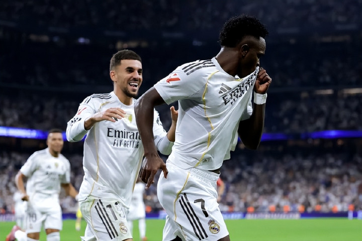 下半场回来皇马继续强攻,第48分钟,巴尔韦德右路长传转移,维尼修斯左路底线前施展个人能力爆趟过人内切抽射近角,1:0!阿隆索随即换人,贝林厄姆和卡马文加替补出场;第69分钟,贝林厄姆一脚直塞打穿对手防线,维尼修斯左路加速突破趟入禁区被回防的拉法-马林直接撞翻在地;主裁判果断判罚点球,姆巴佩将点球权让给维尼修斯;后者没有辜负信任一蹴而就完成了梅开二度,2:0!维尼修斯前8轮西甲直接参与9个进球,合计是5球4助攻,刷新了个人生涯新高。