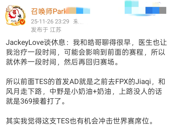 随着冬季转会期接近尾声,LPL和LCK顶尖战队相继官宣了首发大名单。最近,作为LPL话题热度较高的TES,直接来了一波“三连宣”,核心选手JKL、369、Creme相继官宣续约!很多TES粉丝不禁感慨经理郭浩的能力太强了,居然在预算和转会积分都不占据优势的情况下,再次保留住了核心选手。随即,JKL便透露了续约内幕,声称自己跟经理郭浩沟通了伤病问题,自己最终决定续约,但有可能缺席一段时间比赛。对此,有网友认为,JKL第一赛段大概率将休赛,毕竟第一赛段的重要性相对一般,积分很少。