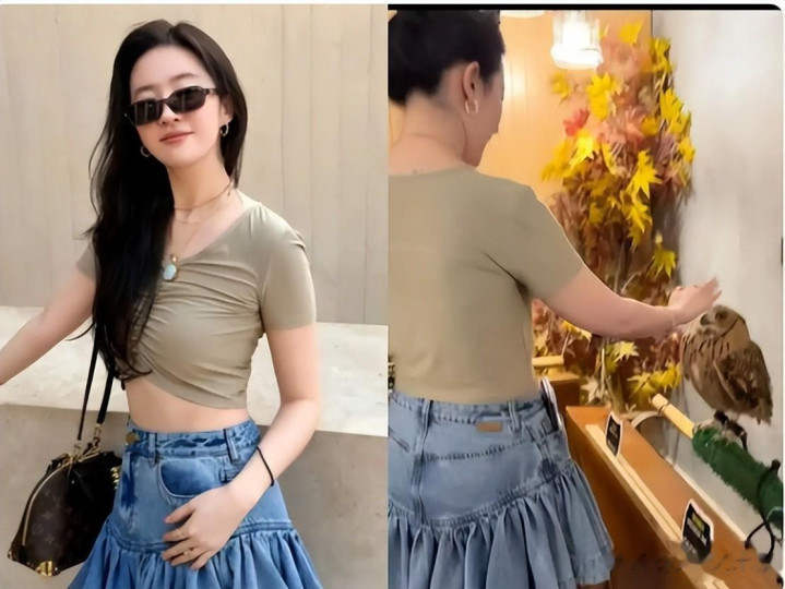 她穿着露脐上衣和高腰牛仔裙,隐约可见的马甲线展示了她坚持锻炼的成果。