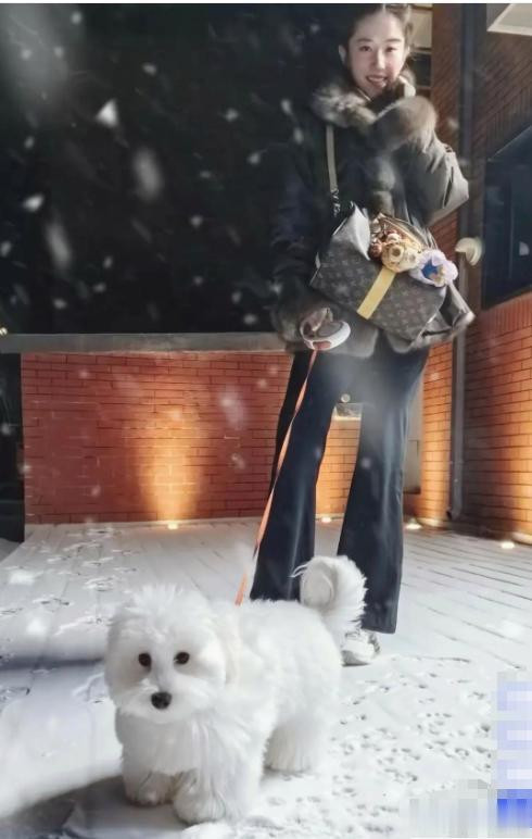 北京初雪后,刘亦菲在社交平台发布了一组素颜遛狗照片,镜头里的她裹着一件紫色貂皮外套,身旁是陪伴多年的爱犬哈哈,在自家小院里踩着积雪。