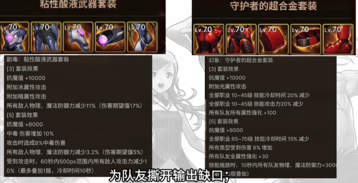 而最近有主播透露,这新的80级版本正在筹备了,而这80版本的新装备很可能会是隔壁服的T级装备。那么大家也是可以先提前参考下隔壁服的装备,可以看到隔壁服的这些80版本史诗套的属性也是各有特色的,这两套辅助套也是能给队友增加不少的伤害,并且各种buff增益效果也是很强的。尤其是这减防御力的属性很关键,能让队友打出更高的伤害。