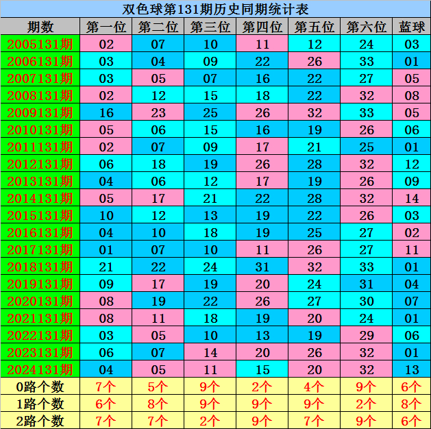 第三位:历史同期0路红球开出:09、12、15、18、21、24;1路红球开出;07、10、13、19、22、25;2路红球开出;11、14,红球012路个数比为9:9:2,当前0路红球历史同期轮空3年,今年同期注意0路红球出现,参考号码24。