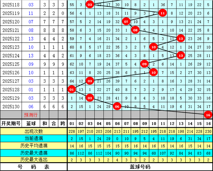 蓝球:历史同期0路号开出:03、06、09、12;1路号开出;01、04、07、13;2路号开出;02、05、08、11、14,蓝球012路个数比为6:8:6,目前历史同期1路蓝球连续出现2年,今年同期预计1路号再出,关注蓝球16。