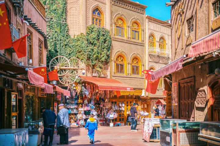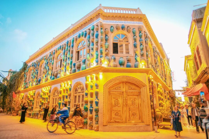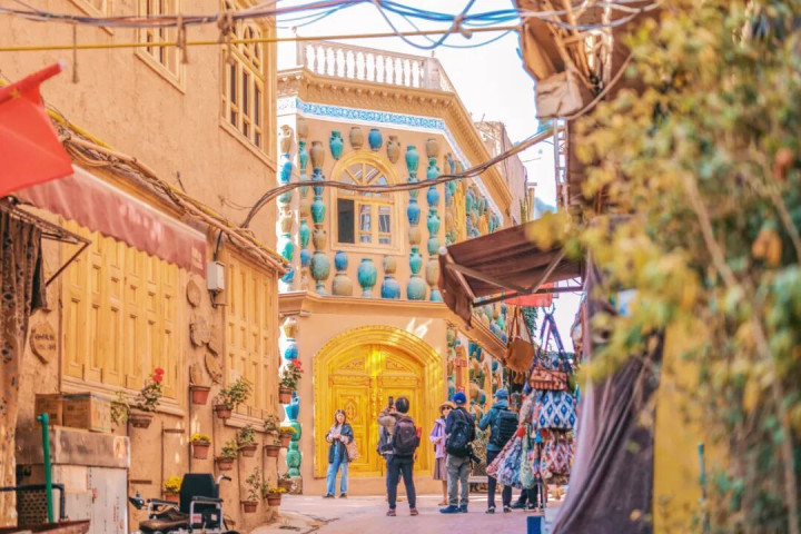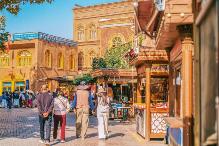 吃完早点到喀什古城逛逛,蜿蜒曲折的巷子里,无数个彩色的窗户和门头引得行人拍照驻足,波斯地毯、老汉巴旦木、艾德莱斯绸,扩印着欧亚大陆文化交流的印记。