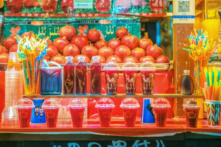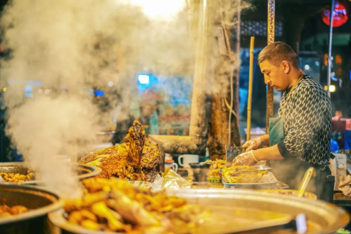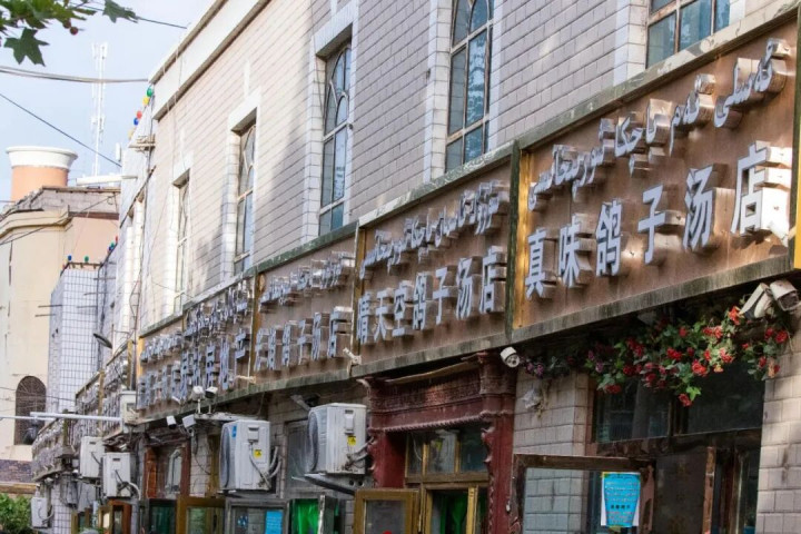 在汉巴扎夜市,一排排咕噜咕噜冒热气的搪瓷缸子摆放在摊位,来上一碗羊汤或者鸽子汤,的确满足。