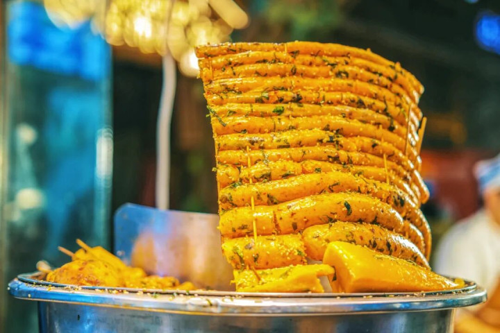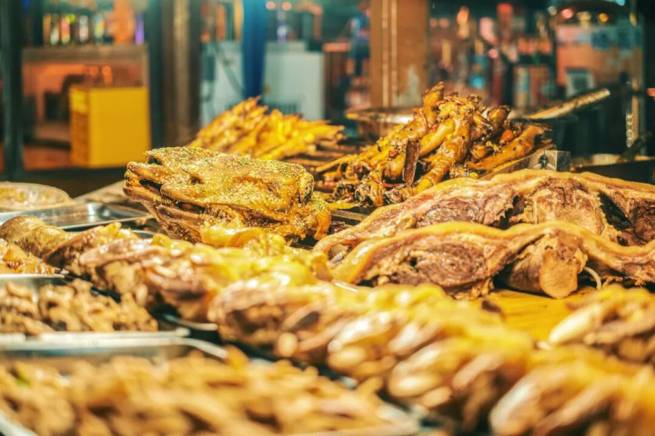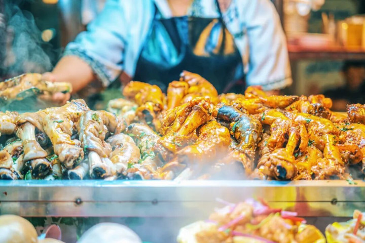夜市上面的烤羊蹄,在灯光的映衬下,显得格外香。