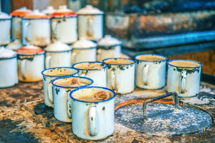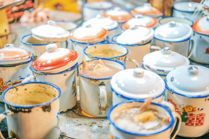 用一只复古的搪瓷缸装满了清炖羊肉的精华,更好地锁住了食材的本真味道。这是20世纪60年代在新疆喀什地区所诞生的传统吃法。