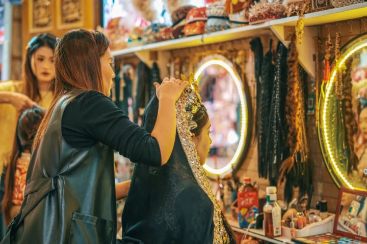 换上blingbling的花裙子,戴上非常好看的四棱小花帽,穿梭于古城的大街小巷,你就是维吾尔最可爱的公主~