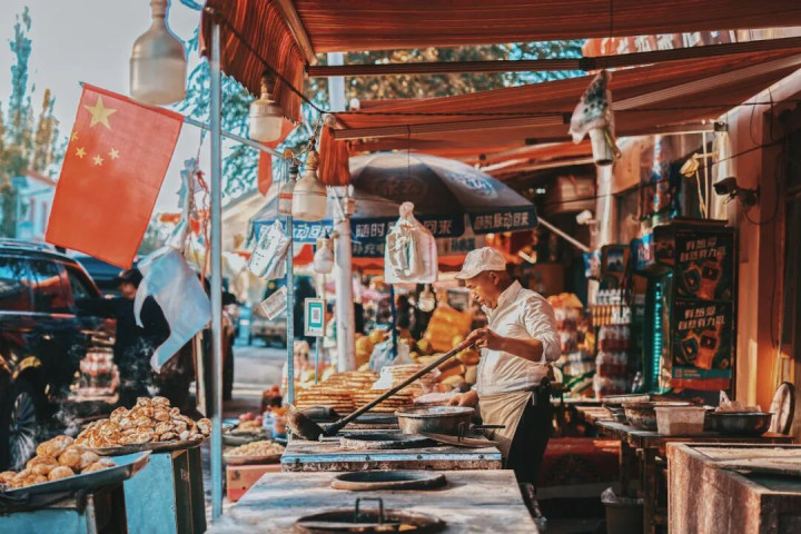 每天的A.M09:00,才是这座城市慢慢苏醒的时间。新鲜出炉的烤包子飘出肉香、早餐店的师傅正在制作现烤馕...慢悠悠的生活节奏里,藏着喀什人民对生活的热爱。