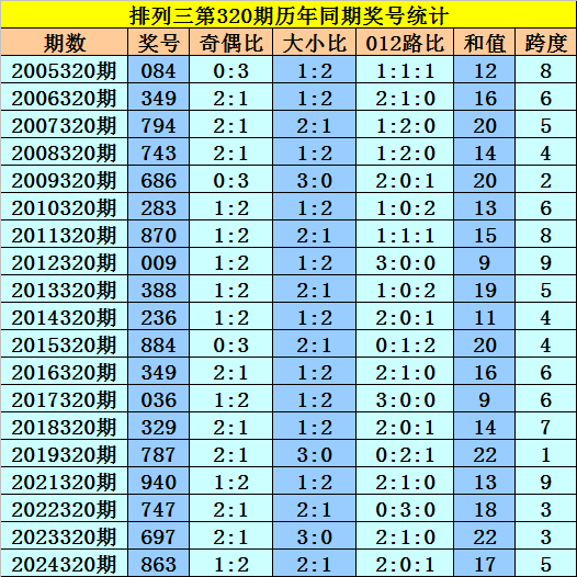 开奖回顾:排列三第2025319期开出奖号865,奖号012路比为1:0:2,大小比为3:0,奇偶比为1:2,最近三年第320期同期开出奖号为:第2022320期:747、第2023320期:697、第2024320期:863。